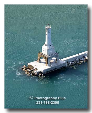 Look for information below the photo Description: #1016 - Aerial photo of the lighthouse at Port Washington, WI, on the west shore of Lake Michigan shot in the winter