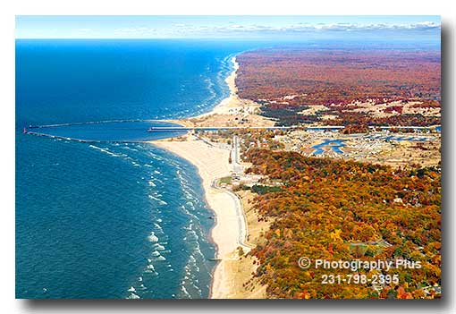 Look for information below the photo Description: #198 - A fall aerial photo of the Muskegon channel into Lake Michigan viewed up the Lake Michigan shoreline from south to north