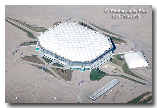 Look for information below the photo Description: #498 - An aerial photo of the Silverdome areana in Pontiac, MI